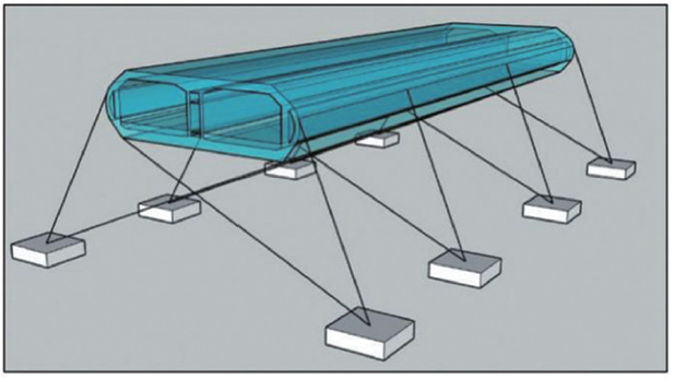 AECOM隧道团队对悬浮隧道设计的方案,是一种采用沉管式隧道结构+多点系绳固定的新设想,其三维模型如图5所示。